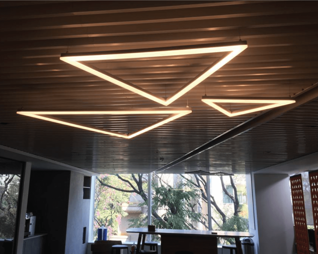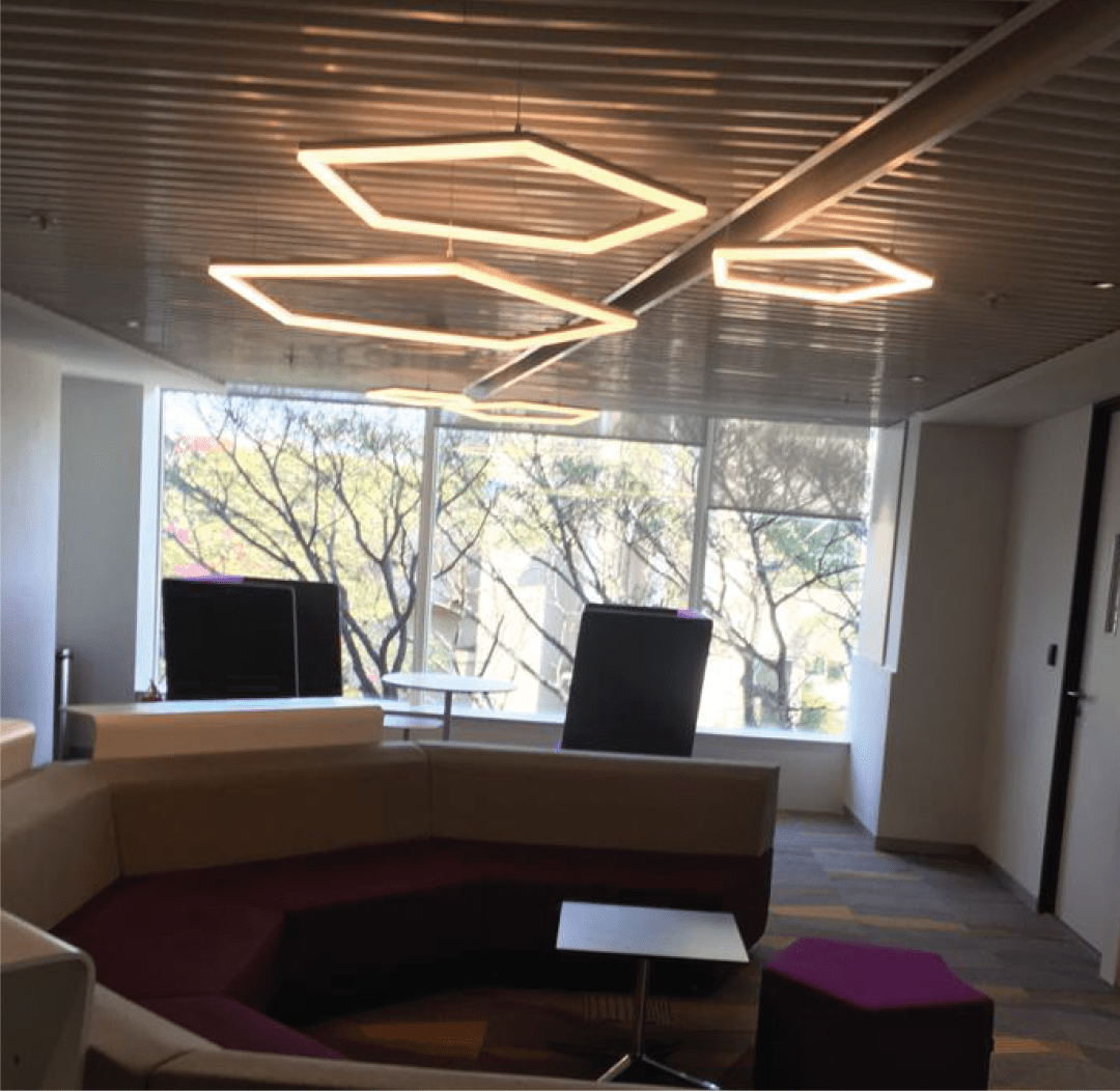 At Infenon, we implemented a diverse range of uniquely shaped suspended lights, including triangular, square, and circular designs, to create a modern and inspiring workplace environment. Our lighting solutions feature innovative diffusers that enhance the indoor lighting experience, providing both functionality and aesthetic appeal. This thoughtful integration of various light shapes contributes to a bright and dynamic atmosphere, promoting productivity and collaboration among employees while reflecting the contemporary design of the workspace.