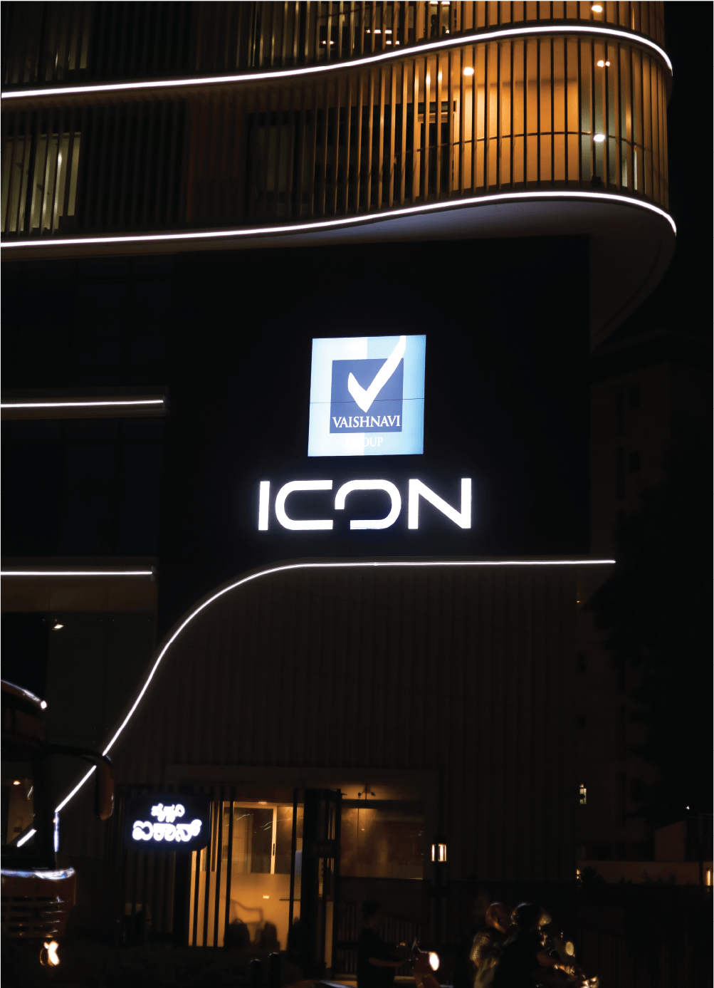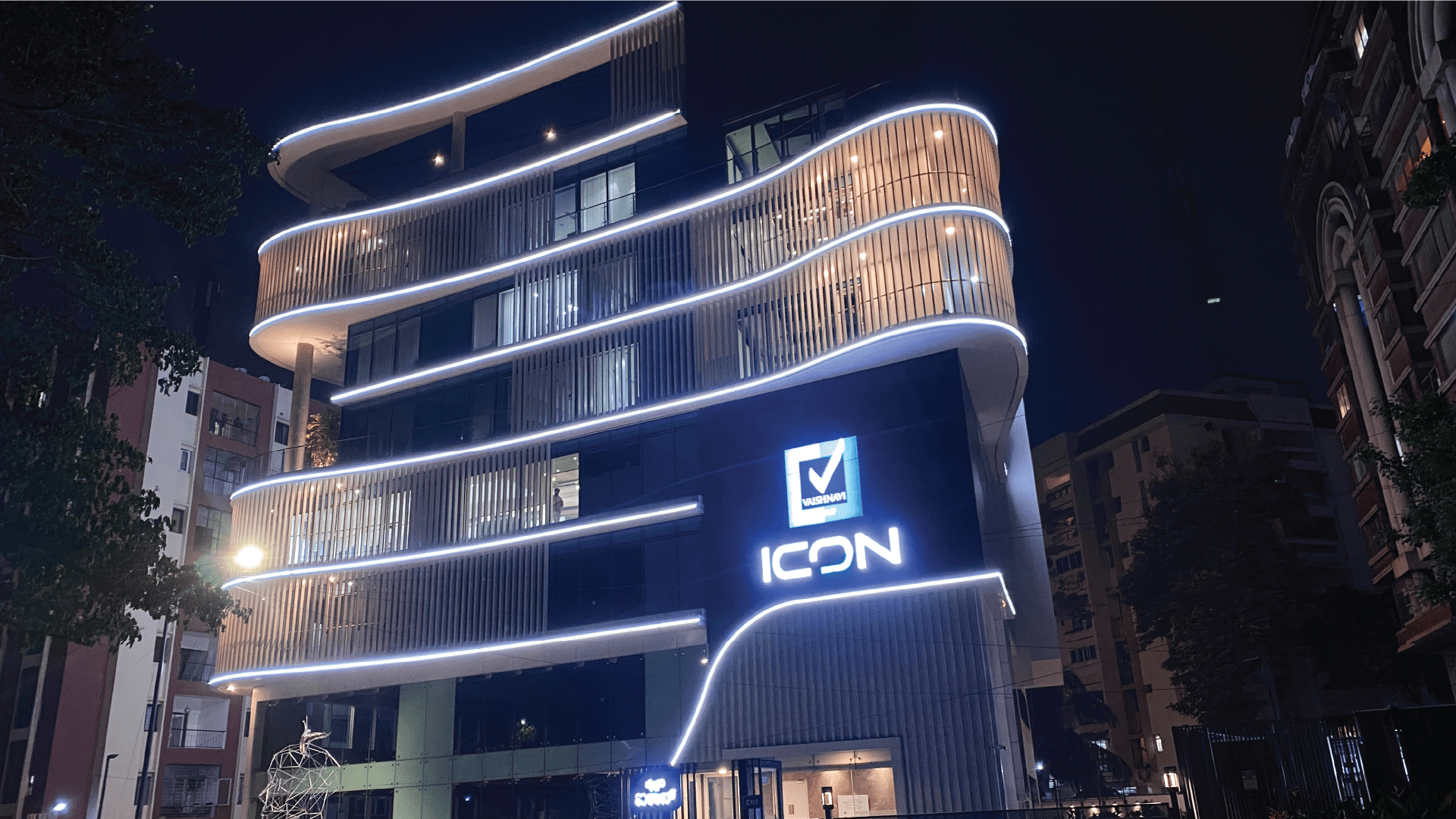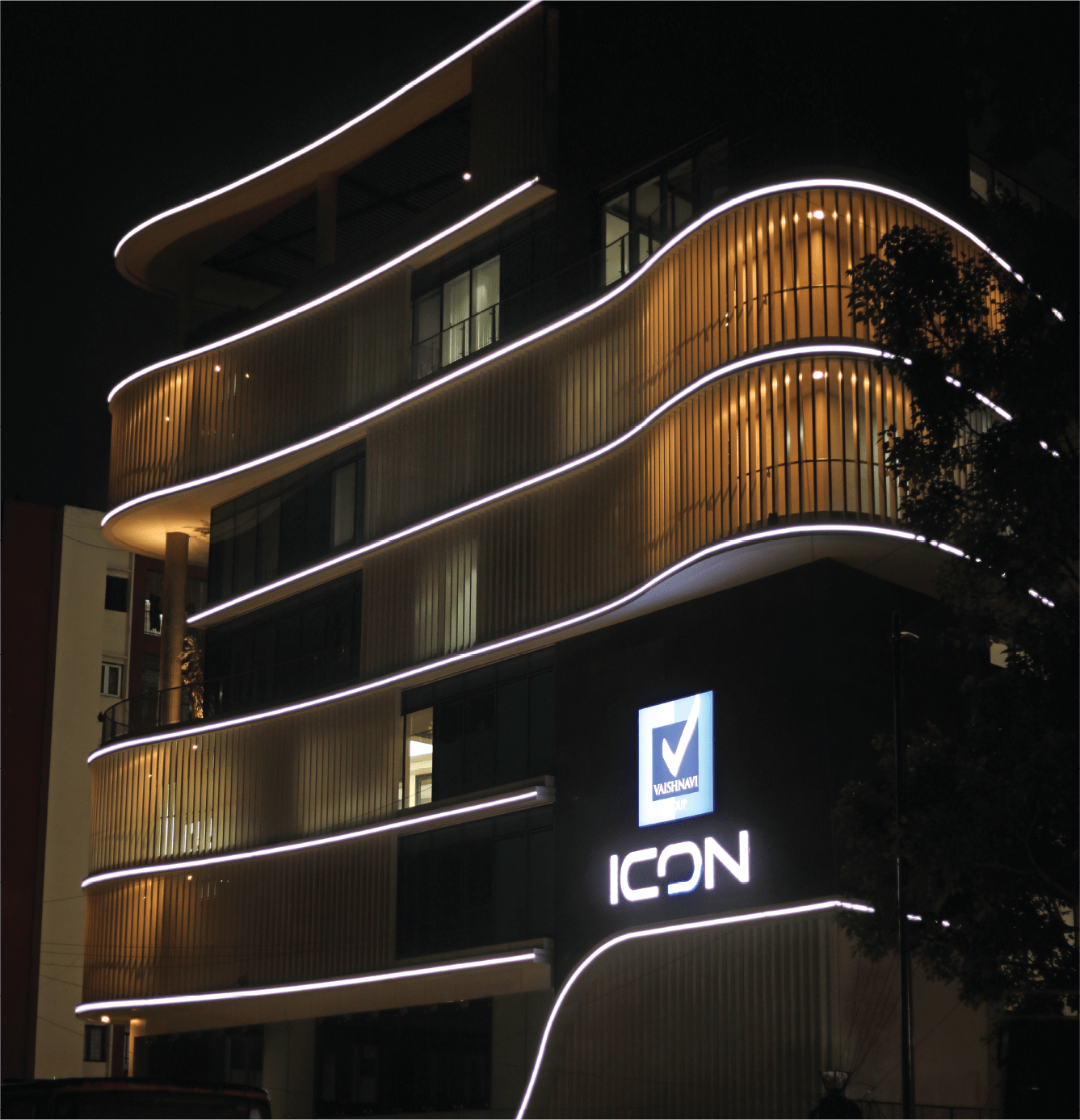 At Vaishnavi Icon, we focused exclusively on facade lighting, utilizing Neo Flex to create a simple yet modern aesthetic that complements the building’s unique curved structure. This design approach enhances the architectural features while providing a sleek and contemporary look. The understated elegance of the lighting design not only highlights the building’s flowing lines but also contributes to the overall ambiance of the surrounding area, making it a standout feature in the neighborhood.