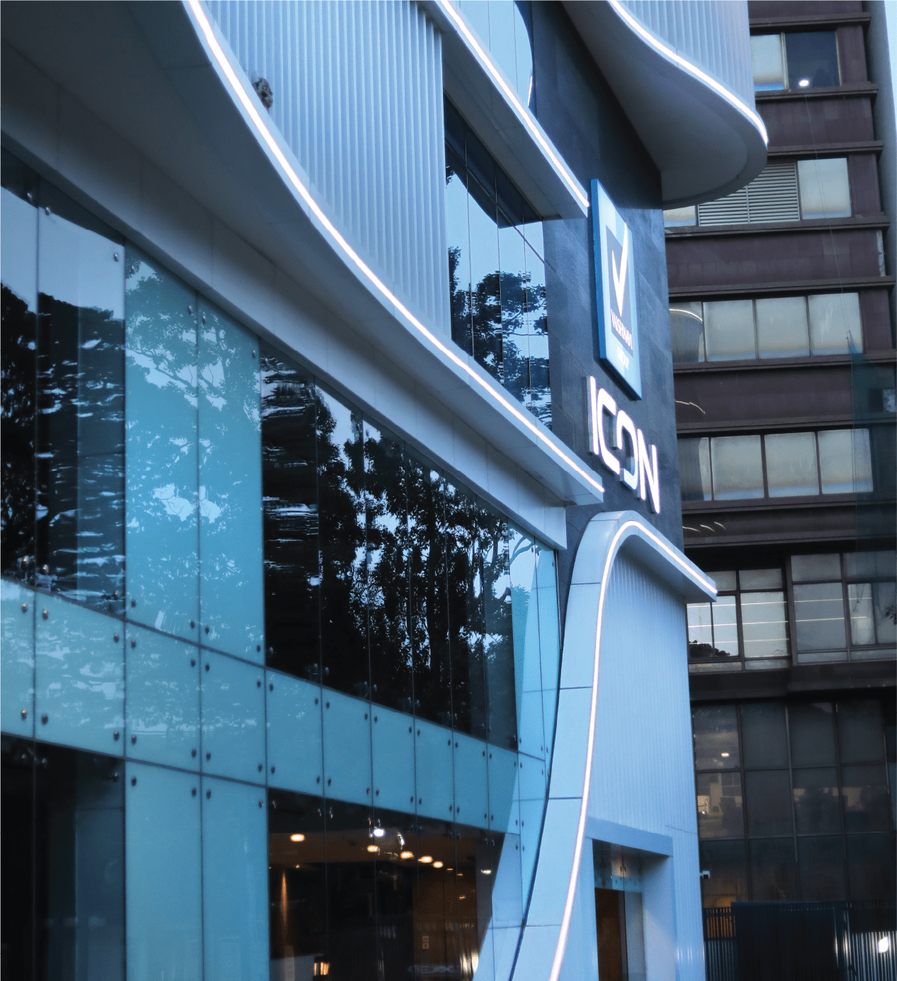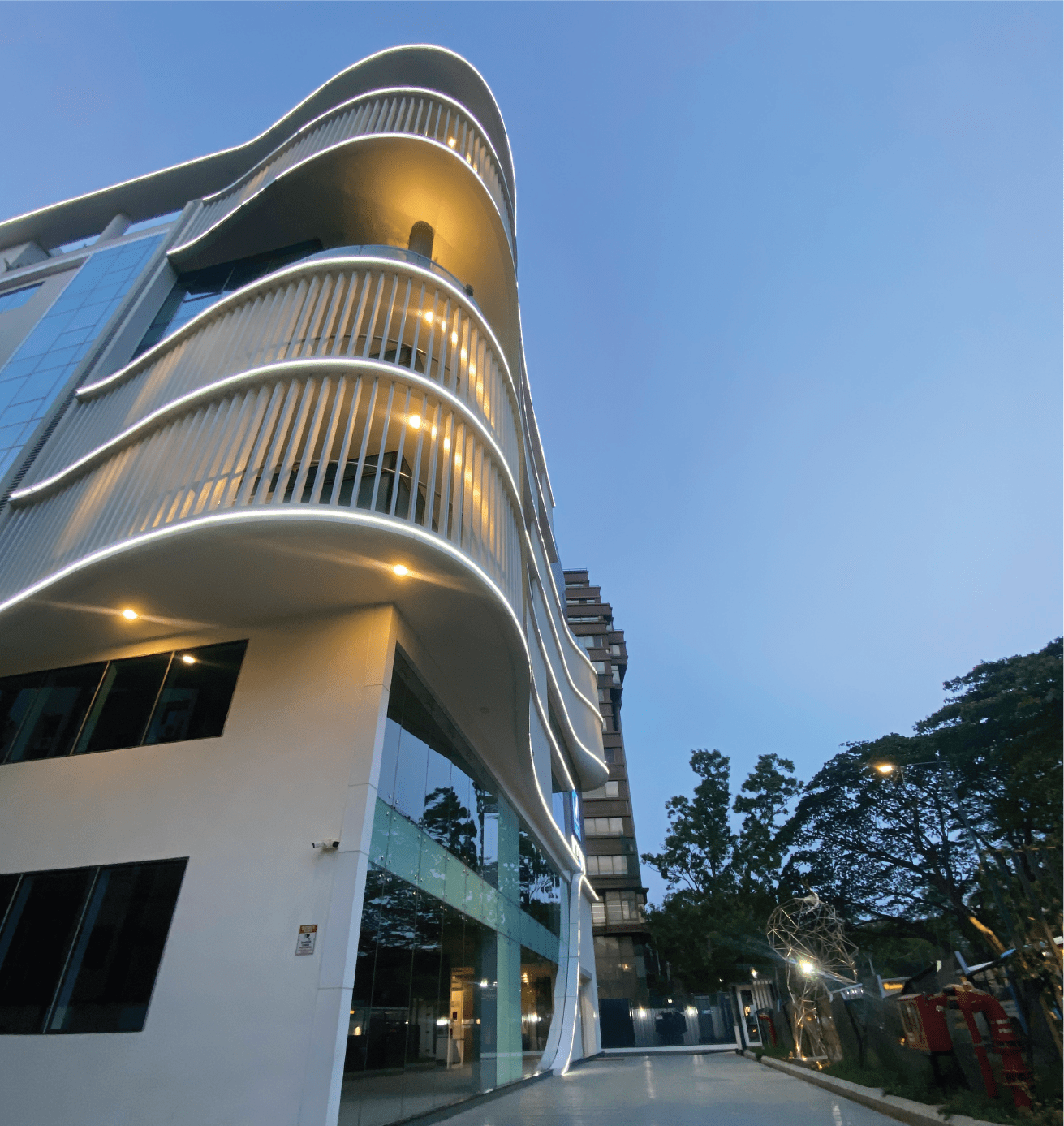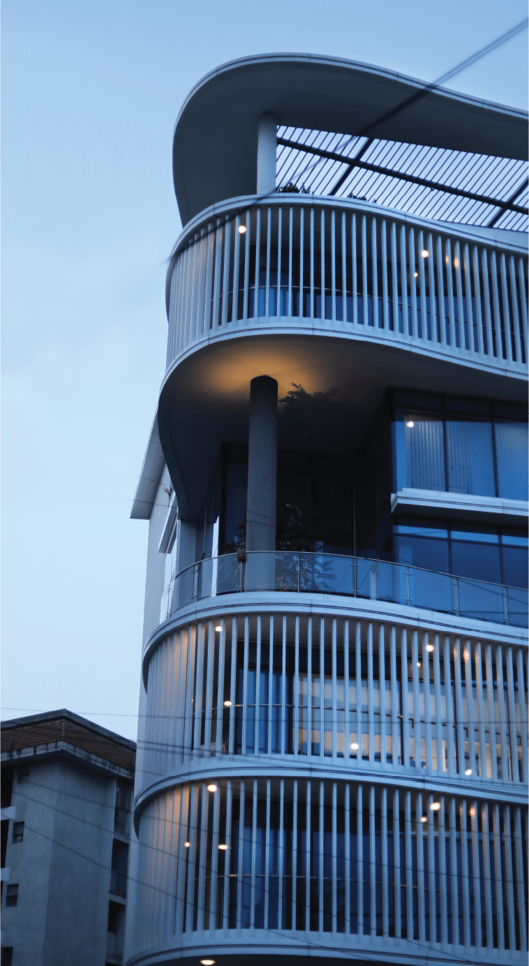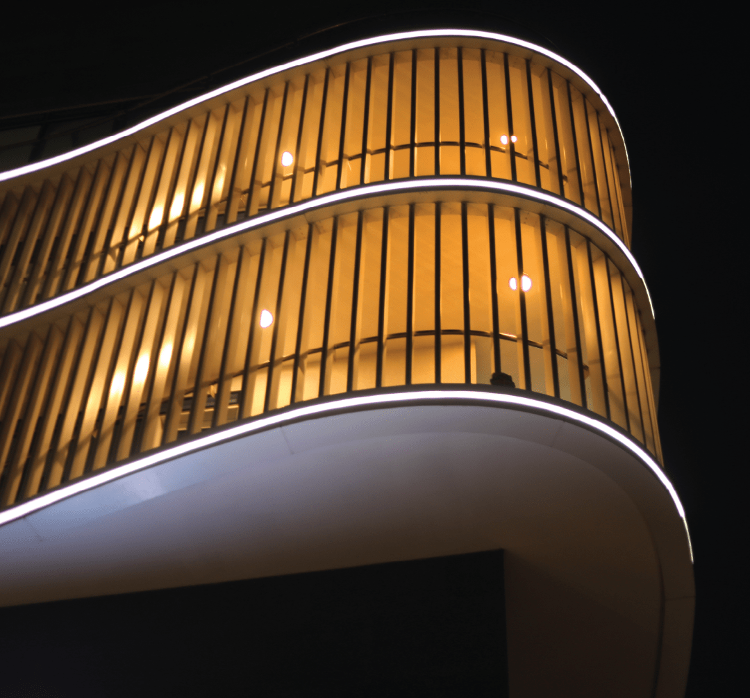 At Vaishnavi Icon, we focused exclusively on facade lighting, utilizing Neo Flex to create a simple yet modern aesthetic that complements the building’s unique curved structure. This design approach enhances the architectural features while providing a sleek and contemporary look. The understated elegance of the lighting design not only highlights the building’s flowing lines but also contributes to the overall ambiance of the surrounding area, making it a standout feature in the neighborhood.